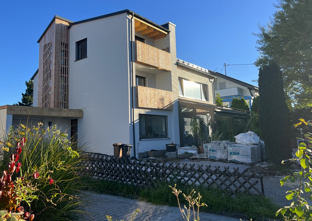 Im Zuge der Sanierung eines Einfamilienhauses wurde ein Aufzug eingebaut. Es wurde ein Aufzugschacht in Holzbauweise mit Verglasung angebaut und um den Aufzugschacht dem Gestaltungskonzept anzupassen wurde er mit Holz verkleidet. Durch die offene Lattung kommt genügend Licht in den Innenraum - der Einblick von Außen wird aber eingeschränkt.